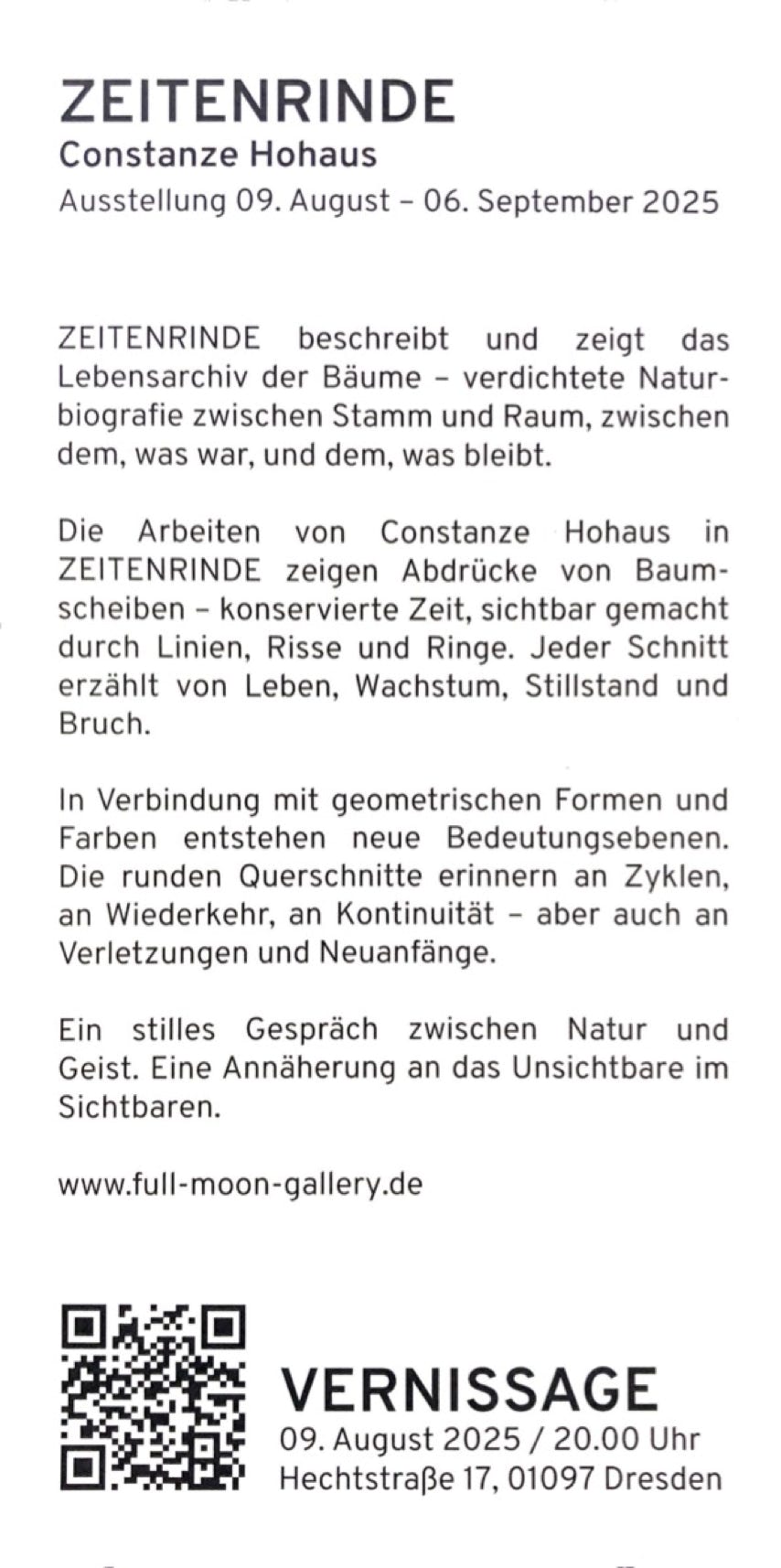 “Zeitenrinde beschreibt und zeigt das Lebensarchiv der Bäume – verdichtete Naturbiographie zwischen Stamm und Raum, zwischen dem, was war, und dem, was bleibt.”
