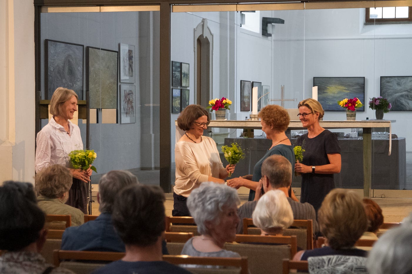 Im Jahr 2009 beschlossen drei Dresdner Malerinnen, sich zu gemeinsamen Projekten (Ausstellungen, Workshops, Besuche von Kunstausstellungen) zusammenzuschließen: Petra Schade, Mechthild Mansel und Constanze Hohaus. Seitdem ist eine beachtliche Anzahl von Ausstellungen der „Farbfinder“ in und außerhalb von Dresden realisiert worden. Diesmal stellen sie in dem wunderschönen, vom Kirchenraum abgetrennten Teil der Stadtkirche St. Petri in Freiberg ihre Arbeiten unter dem Titel „Widerhall“ aus. Sie meinen damit das Phänomen Farbe, das immer in ihnen aufklingt und Hauptthema ihrer Arbeit ist, sowie die große Resonanz des hell gestalteten Veranstaltungsraumes, in dem die Bilder der drei in dem einfallenden Licht kostbar leuchten.